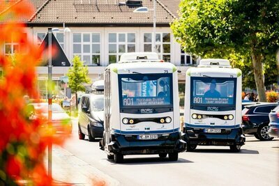 Bildunterschrift: Autonome Busse in der Stadt Monheim schon unterwegs Foto: Tim Kögler; Stadt Monheim